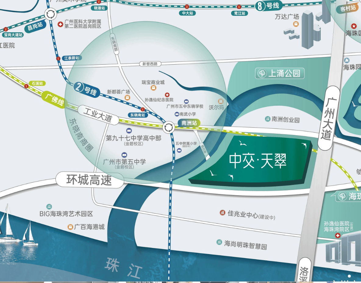 城市的发展,往往沿着特定的轴线展开。正在广州,这条轴线不只仅是地舆上的划分,更是资本、财富取机缘的流动通道。中交天翠所处的,可谓是广州城市成长计谋中的“心净地带”。项目坐落于海珠区广州大道南1818号,这里刚好是新中轴线向南延长的环节节点,同时也是珠江后航道滨水景不雅带的核地。这种双沉轴线的交汇,付与了地块无可复制的先天劣势。